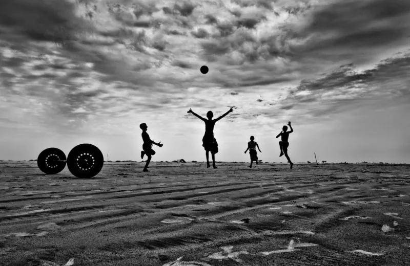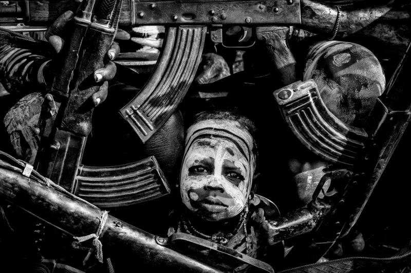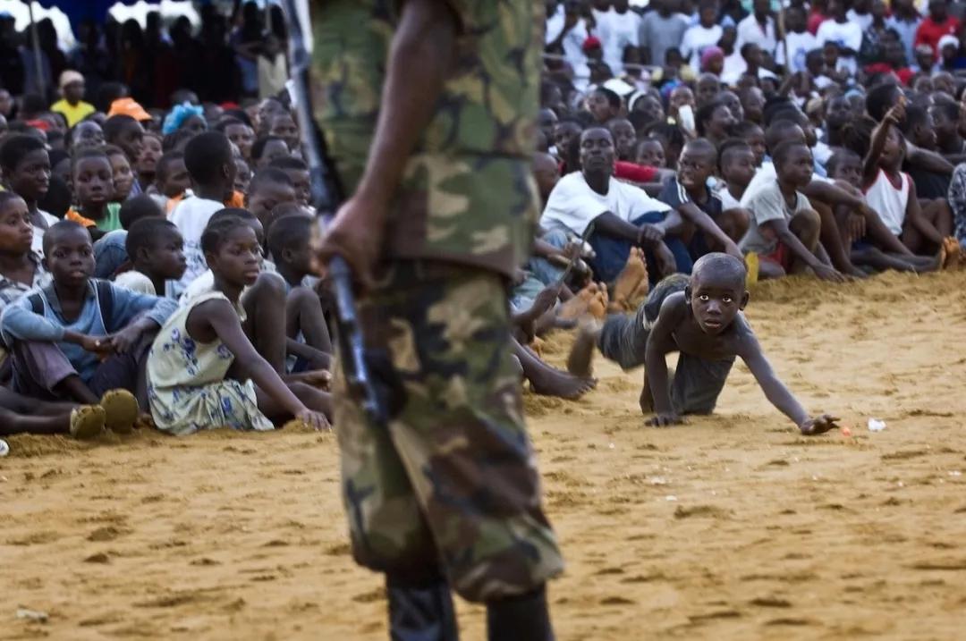 當他把鏡頭對準其中一名士兵的時候,在圍觀的人群中突然間鉆出來一個小男孩,試圖撿回他掉出去的球。利比里亞經(jīng)歷了多年的內(nèi)戰(zhàn),這個小男孩在戰(zhàn)爭中長大,他本能地害怕士兵和他們手中的槍。他想要把自己寶貴的球撿回來,然而他的眼睛卻一直緊緊盯著前面的士兵。