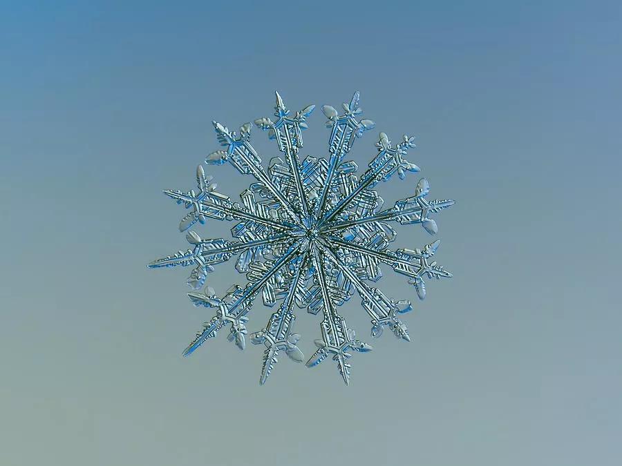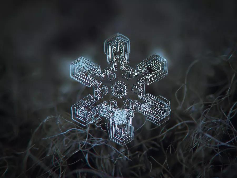 在他的微距鏡頭下,紛紛揚(yáng)揚(yáng)的一場場雪被“拆碎”,形態(tài)各異的冰晶呈現(xiàn)出各式形狀規(guī)整、樣式精美的圖案,在讓人沉迷于雪花無限美麗與夢幻的同時,亦讓人不禁贊嘆大自然的神奇。