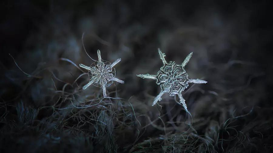經(jīng)過多次嘗試后,克拉托夫最后采用了兩種辦法拍攝,一種是讓雪花落在深色的羊毛織物上,混合著渾濁天空下的自然光拍攝;另一種是使用 LED 燈作為輔助工具,逆光拍攝宛若水晶一般的雪花。