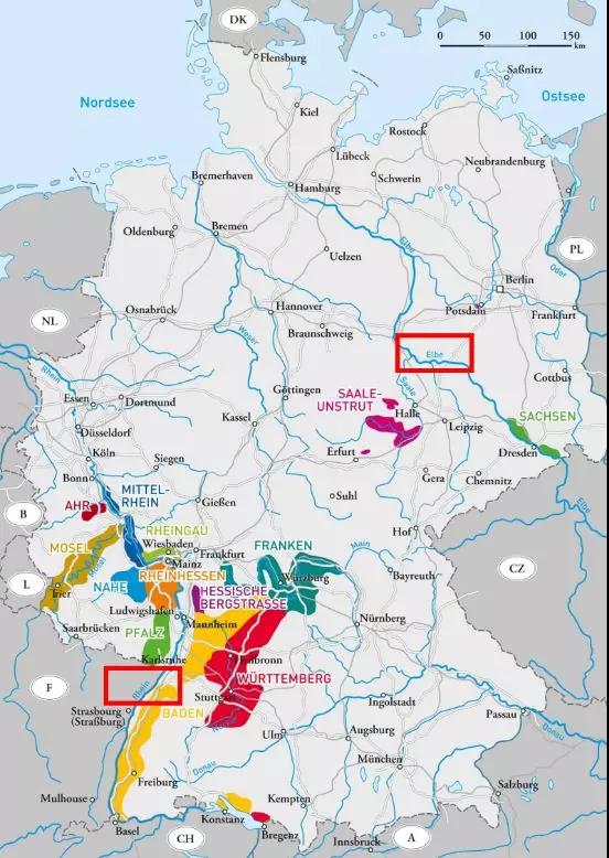 除了南部略顯溫暖的巴登(大致氣候與香檳、勃艮第類似)外,其余產(chǎn)區(qū)幾乎全部都在最冷涼的A區(qū)。