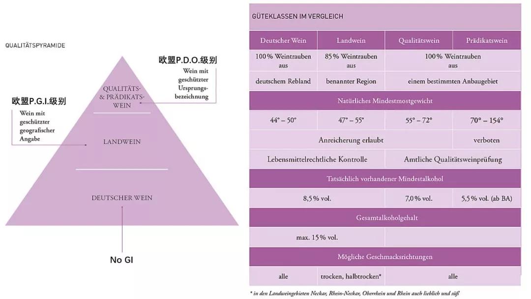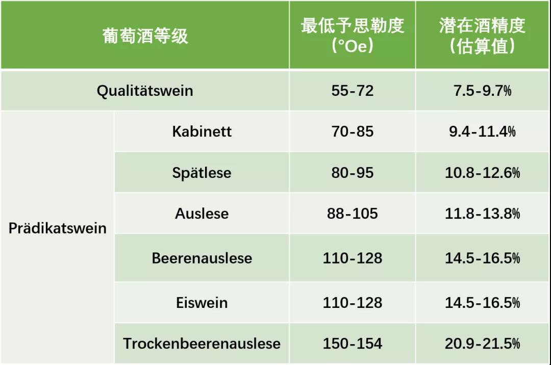 1971年,德國(guó)頒布了一套葡萄酒分級(jí)法規(guī):葡萄采收時(shí)成熟度(最低含糖量,以予思勒度°Oe)越高,對(duì)應(yīng)葡萄酒的等級(jí)就越高。