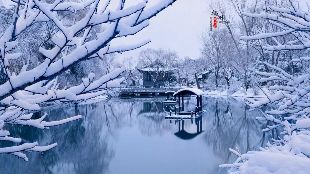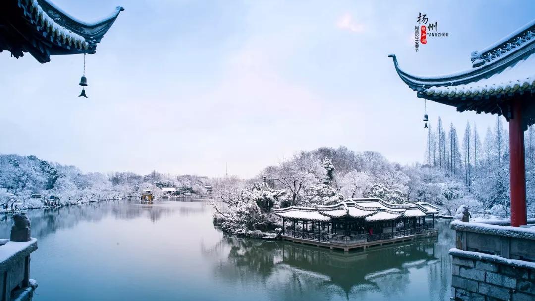 白雪灑滿十里揚州路,燈光耀然醒目,映襯著如虹跨澗的紅橋勝似火。