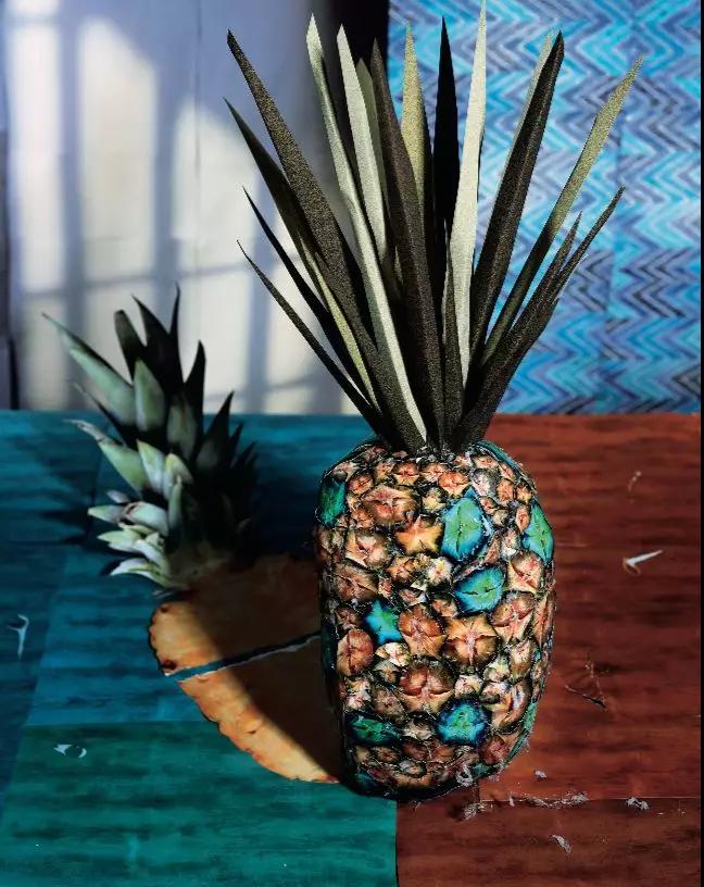 組成“靜物”的絕大部分食物都是水果,甚至還有用紙殼打印的假菠蘿——丹尼爾·戈登(Daniel Gordon) 的《菠蘿和影子》 (Pineapple and Shadow, 2011),如果僅以它們作為食物,好像可以直接加入果食主義者(Fruitarian)的行列了。直到這一面面深藍背景展墻的水果盛宴快要結束之時,才出現了少許葷食。