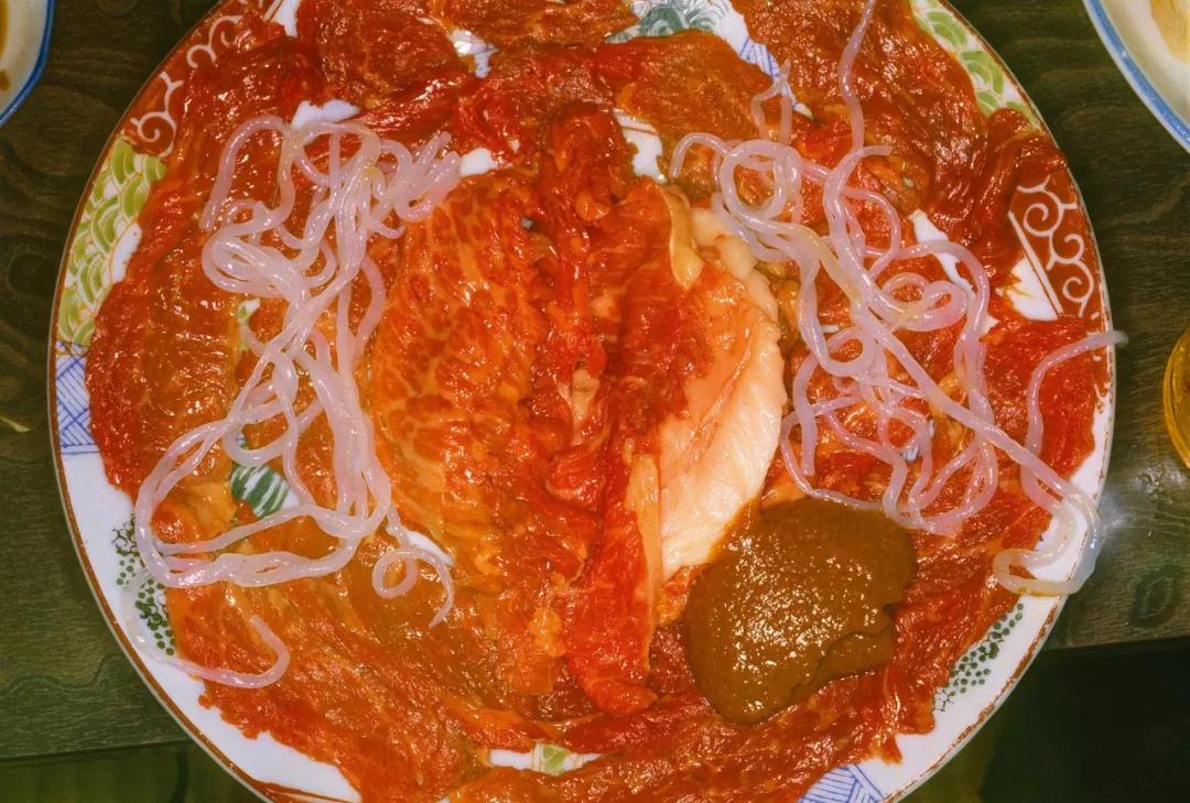 日本攝影家荒木經惟有一組名為《盛宴》(The Banquet, 1993)的作品,選取四張,模樣都有點張揚,其中一盤最為生猛,能讓一路看過來已經懷念肉食的觀眾趕緊轉頭再看幾眼水果。當今的食物照片多數用于傳播和分享,絕大多數都以精致面目示人,這樣一組照片通過近乎冒犯的方式提醒觀眾:不僅食物本身,就連食物的呈現其實都是多樣的。