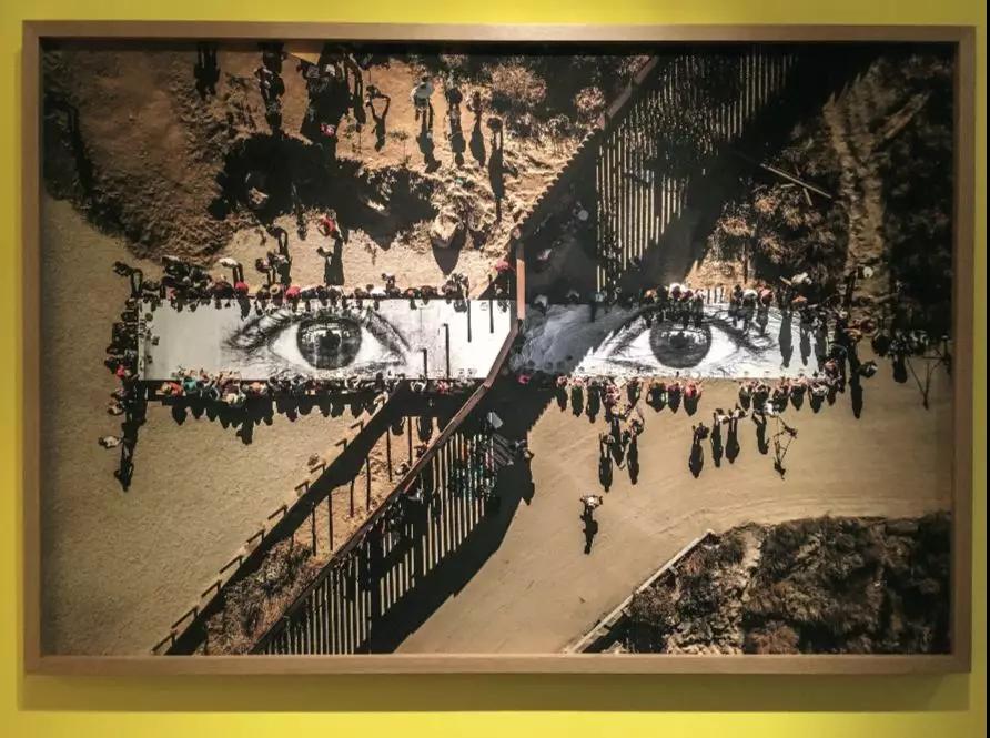 這種平靜馬上被接下來的作品打破。法國藝術家JR在 2017 年拍攝于美國與墨西哥邊境的作品《移民,梅拉,穿越邊境的野餐》(Migrants, Mayra, Picnic Across the Border)直接以一雙眼睛和觀眾對視。照片從空中俯拍,應該由無人機完成,細看之下,這雙眼睛印在一張有兩種形態的餐桌上,一種是堅硬的桌子,另一種是柔軟的桌布。桌子和桌布并未真正相接,但因為視覺和情感上的慣性,把它們看作是一張穿越了邊境的餐桌。與這張餐桌對視,有那么一刻,可以忽視墻的阻隔,只看見這些同吃同喝的人們。