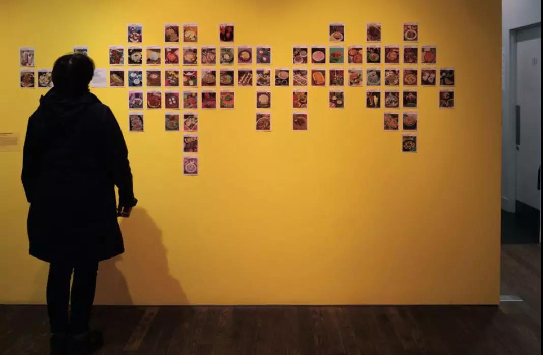 《減肥者食譜卡片》(Weight Watchers Recipe Cards, 1974)幾乎鋪滿了一整面墻。這面墻也最受觀眾歡迎,明黃底色之下,滿墻各式各樣的食物,引發熱烈討論,時而歡聲笑語,熱鬧若市,引得剛入場的觀眾側目。粗看之下,這就是一墻食物,細細看來往往都要吸幾口涼氣:這些食物在外形上都有超越常規審美的模樣,大多濃厚濁膩,用“黑暗料理”形容不為過,有的甚至算得上“邪典料理”……目的何在?——《減肥者食譜卡片》。理論上,減肥需要控制飲食并加強鍛煉,控制飲食的方法不少,遏制食欲無疑能從源頭上解決問題。于是,這些有助于遏制食欲的小卡片應運而生,可謂“一本正經胡說八道”,難怪觀眾會邊看邊笑。