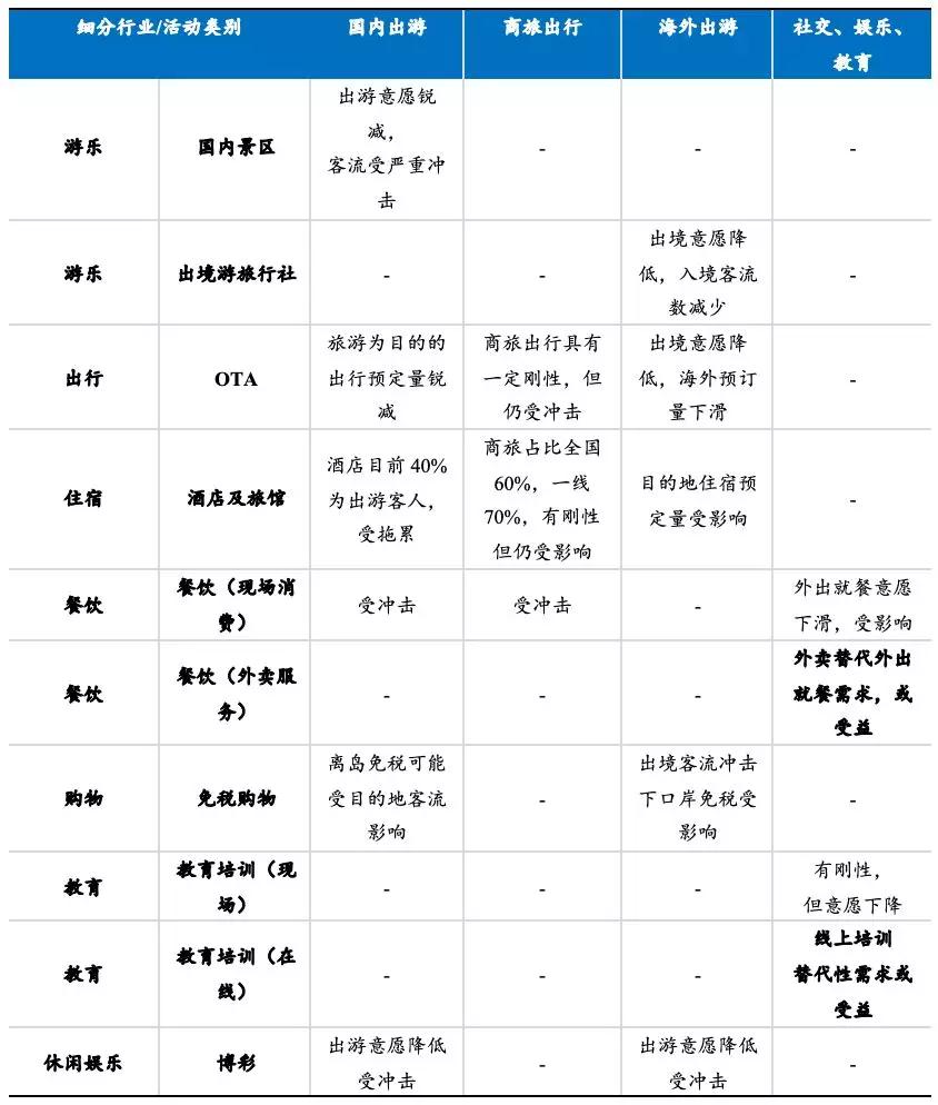 這是因為,旅游行業中的幾乎所有細分領域均涉及人群聚集與社交。不同于其他危機事件僅對某具體細分影響,例如國際關系僅影響出入境客流,流行性傳染病窗口期對旅游行業會構成全面沖擊。