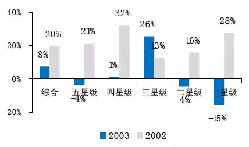 酒店住宿業當年受到的沖擊非常明顯。2003年,全國星級飯店出租率同比下降4%,收入增速僅為8%,相比2002年的增速下滑12%。低星級收入受到的沖擊更明顯,其中一星級飯店收入增速下滑高達43%,二星級飯店收入增速亦有20%的放緩。