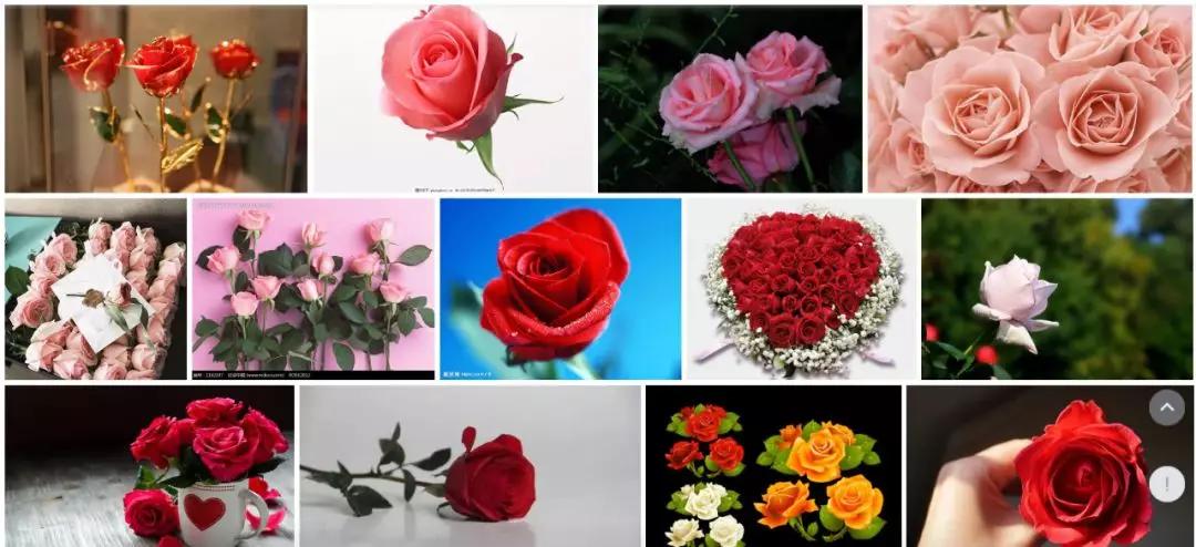 搜索“玫瑰”,得到這樣一大串圖片,它們沒有什么特別、新穎之處。這樣的照片與我們的感知模式一致,因此只是加強了“玫瑰長著樣兒”的固有認知,但對圖片本身不會形成記憶。