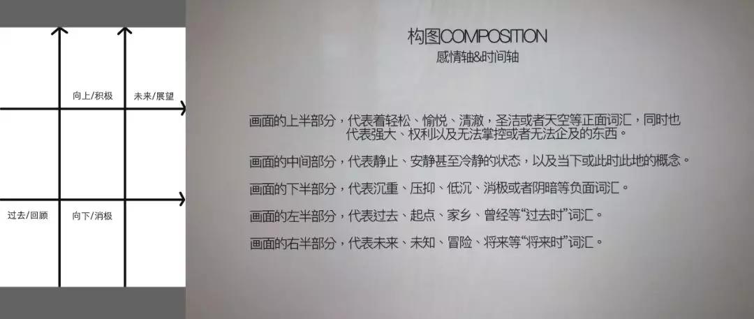 1.畫面中下-中-上/左-中-右的方向軸(以及由此構成的不同區域空間),既是視覺觀看(基本)的時間順序軸,也是視覺心理的情緒變化軸。