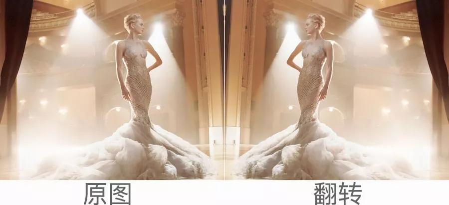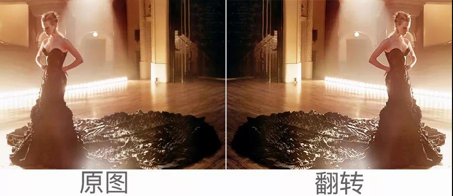 人物面部朝左,視覺情感傾向是憂郁內斂的,配合低頭的姿態,仿佛有一種回顧往昔、自我勉勵、積蓄力量以面對未來挑戰的感受。無論是禮服的色彩還是遠景處的黑色部分都非常貼合這種情感聯想。反之,翻轉后則被削弱了。并且由于右邊空間的壓縮,使人物產生一種畏縮、抗拒未來的感覺。