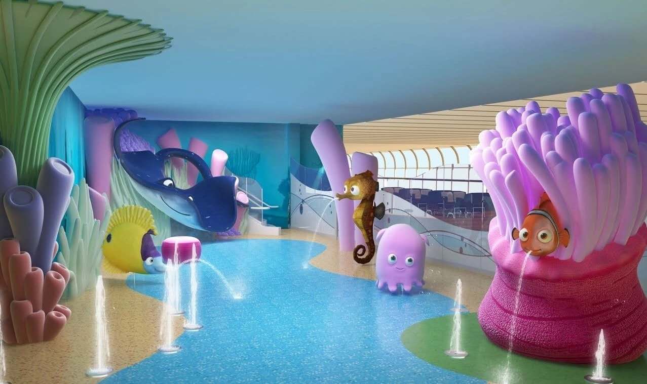孩子們可以在尼莫(小丑魚)的珊瑚礁海灘上休息一下,這是由玻璃圍墻包圍,1500平方英尺,柔軟的濕甲板表面區(qū)域的完美的海灘,迷你水游戲區(qū),一個(gè)有趣的水上樂(lè)園,里面有迪斯尼電影《海底總動(dòng)員》里的水下角色。