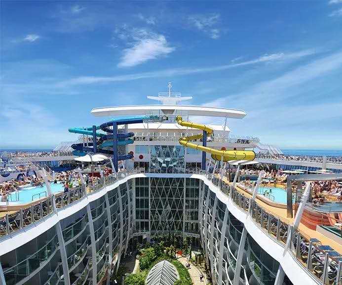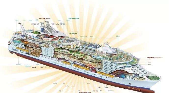 像皇家加勒比的海洋綠洲號,長約360米,寬約47米,吃水線以上高約65米,共16層甲板,而郵輪最低層甲板在五層