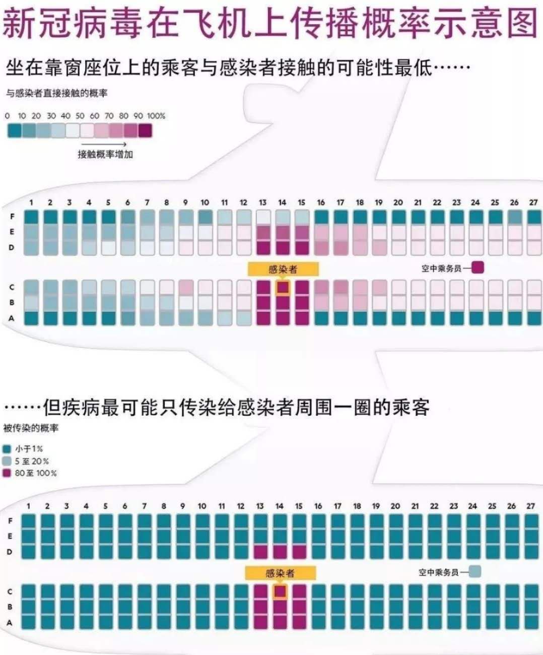 對于其他位置的乘客,危險性并不顯著,這是由于客艙空氣在橫斷面上循環,飛沫的播散被限制在少數幾排座位。