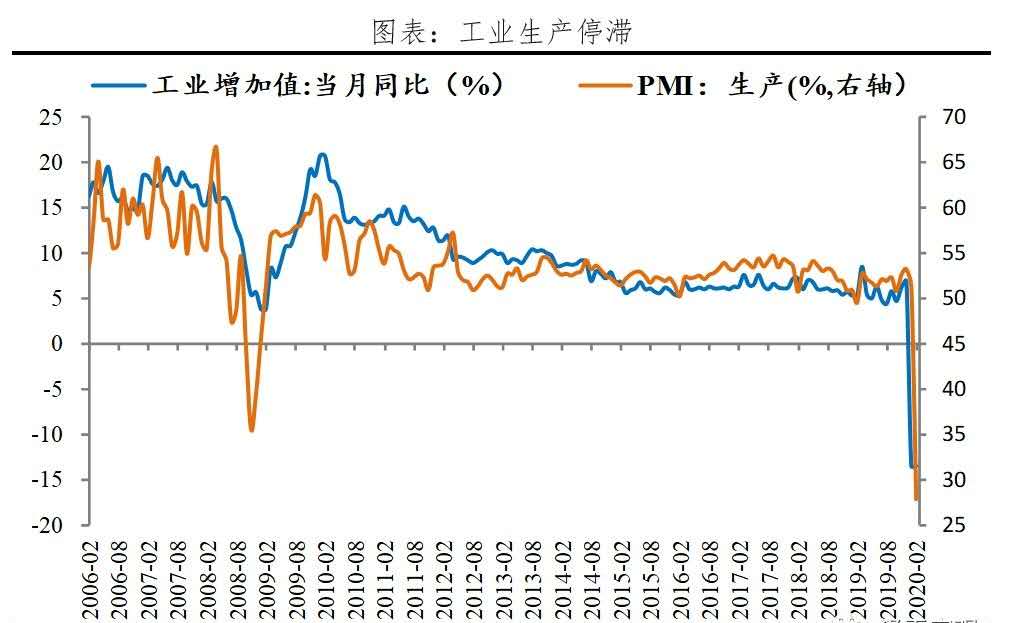 受疫情沖擊,中國1-2月經(jīng)濟(jì)暫時停擺,生產(chǎn)投資消費(fèi)冰封,經(jīng)濟(jì)數(shù)據(jù)暴跌,一季度GDP已鐵定負(fù)增長。代價沉重,勝利來之不易。1-2月規(guī)模以上工業(yè)增加值同比-13.5%,2019年12月為6.9%。1-2月城鎮(zhèn)固定資產(chǎn)投資(不含農(nóng)戶)同比-24.5%,2019年為5.4%。1-2月房地產(chǎn)開發(fā)投資同比-16.3%,2019年為9.9%。1-2月社會消費(fèi)品零售總額同比-20.5%,2019年12月為8%。2月新增社會融資規(guī)模為8554億元,比上年同期少增1111億元。