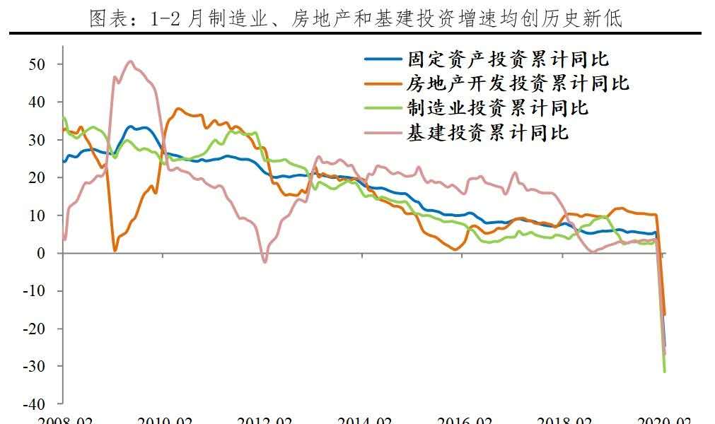 固定資產(chǎn)投資增速創(chuàng)歷史新低,民間投資下滑幅度更大。1-2月固定資產(chǎn)投資累計同比-24.5%,較去年全年下滑29.9個百分點(diǎn),較去年12月當(dāng)月同比下滑36.3個百分點(diǎn),創(chuàng)歷史新低。分產(chǎn)業(yè)看,第一、二、三產(chǎn)業(yè)投資同比分別為-25.6%、-28.2%、-23.0%,分別較去年全年下滑26.2、31.4、29.5個百分點(diǎn)。分地區(qū)看,東部、中部、西部、東北地區(qū)同比分別為 -20.2%、-32.7%、-25.0%、-18.9%,分別較去年全年下滑24.3、42.0、30.6、21.9個百分點(diǎn)。從投資主體看,民間固定資產(chǎn)投資同比-26.4%,較去年全年下滑31.3個百分點(diǎn),下滑幅度大于整體。