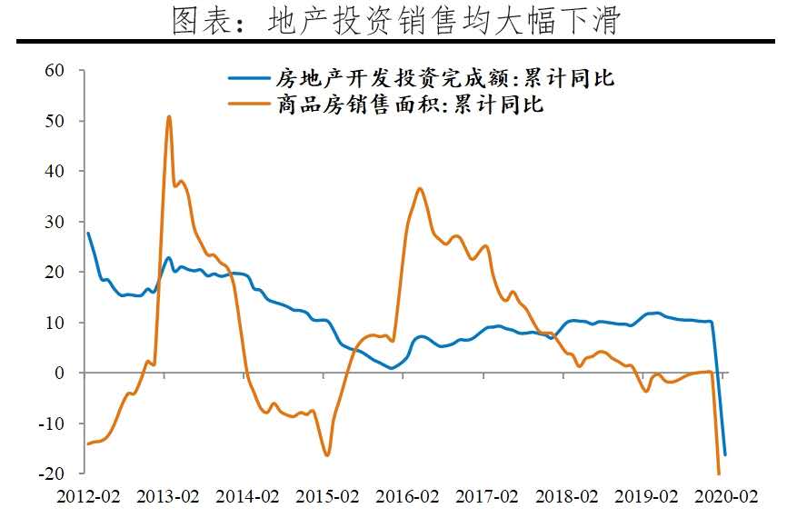 1-2月房地產(chǎn)投資累計同比-16.3%,較去年12月下滑23.7個百分點(diǎn),創(chuàng)歷史新低。1)土地購置負(fù)增長,但土地溢價率較去年三四季度有所恢復(fù)。部分百強(qiáng)企業(yè)前兩月在土地市場零投資,1-2月土地購置面積累計同比-29.3%,較去年12月下滑36.8個百分點(diǎn)。據(jù)中指院數(shù)據(jù),1-2月300城土地平均成交溢價率分別為11.6%和11.1%,而去年三四季度分別為10%和9%,300城住宅用地流拍面積減少37%。2)新開工、竣工增速均暴跌。1-2月新開工面積、施工面積、竣工面積累計同比分別為-44.9%、2.9%、-22.9%,分別較12月下滑52.3、6.2和43.1個百分點(diǎn)。3)庫存去化速度放緩,但仍處歷史低位。1-2月商品房待售面積累計同比為1.4%,較12月上升5.2個百分點(diǎn),但由于此前庫存去化充分,當(dāng)前商品房待售面積仍為近五年低位水平。未來復(fù)工推進(jìn)、地產(chǎn)銷售復(fù)蘇、加快期房竣工和舊改等,將托底房地產(chǎn)投資。