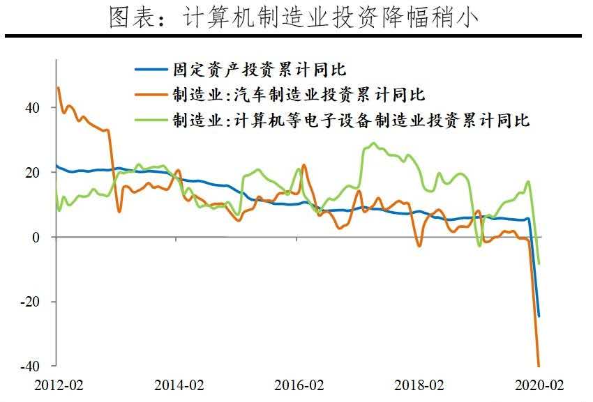 41個大類行業(yè)中僅油氣開采和煙草2個行業(yè)增加值同比正增長,612種產(chǎn)品中僅79種產(chǎn)品同比增長,部分高技術(shù)產(chǎn)品保持較快增長。而在去年12月,41個行業(yè)中有33個正增長,605種產(chǎn)品有365種正增長。1)1-2月汽車工業(yè)重回負(fù)增長,同比-31.8%,較12月大幅下滑42.2個百分點(diǎn)。分車型產(chǎn)量看,SUV、轎車和新能源車產(chǎn)量同比分別為-41.3%、-49.8%和-62.8%。2)出口相關(guān)產(chǎn)業(yè)電氣機(jī)械、金屬制品、通用設(shè)備、專用設(shè)備、橡膠塑料和紡織工業(yè)增加值同比分別為-24.7%、-26.9%、-28.2%、-24.4%、-25.2%和-27.2%,分別下滑37.1、33.2、33.1、30.9、28.9和27.4個百分點(diǎn)。3)鋼鐵有色等連續(xù)生產(chǎn)型行業(yè)降幅稍小。有色和黑色金屬冶煉同比分別為-8.5%和-2%,分別下滑13.5和12.7個百分點(diǎn)。4)疫情提振醫(yī)療防護(hù)和生活物資需求,口罩、發(fā)酵酒精產(chǎn)量同比分別為127.5%和15.6%,凍肉和方便面同比分別為13.5%和11.4%。5)部分高技術(shù)產(chǎn)品智能手表、智能手環(huán)、半導(dǎo)體分立器件和集成電路產(chǎn)量同比分別為119.7%、45.1%、31.4%和8.5%。分地區(qū)看,東部、中部、西部和東北地區(qū)同比分別為-16.9%、-16.7%、-7.6%和-11.5%,分別較12月下降23.8、23.4、15.4和20.5個百分點(diǎn)。