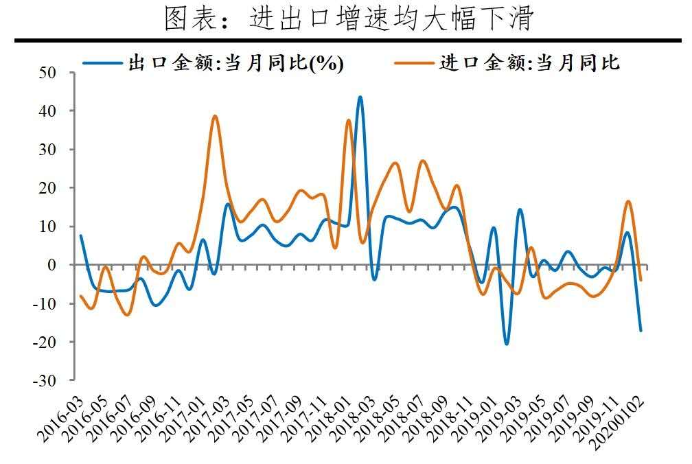 出口大幅下滑,主因疫情導(dǎo)致部分國家對華貿(mào)易管制以及國內(nèi)企業(yè)延遲復(fù)工;進(jìn)口增速下滑幅度不及出口,貿(mào)易差額由正轉(zhuǎn)負(fù)。1-2月中國出口(以美元計)累計同比-17.2%,較去年12月下滑25.1個百分點(diǎn);進(jìn)口(以美元計)累計同比-4.0%,下滑20.5個百分點(diǎn);貿(mào)易差額-71億美元,減少543.1億美元。出口方面,對主要地區(qū)均不同程度下滑,勞動密集型產(chǎn)品出口下滑幅度最大。1-2月中國對美國、歐盟、日本、東盟、中國香港和韓國的出口累計同比分別為-27.7%、-18.4%、-24.5%、-5.1%、-20.4%和-18.6%,均較去年12月下滑10個百分點(diǎn)以上;七大勞動密集型產(chǎn)品、機(jī)電產(chǎn)品和高新技術(shù)產(chǎn)品出口累計同比分別為-26.3%、-16.2%和-15.2%,均下滑15個百分點(diǎn)以上。進(jìn)口方面,大宗商品進(jìn)口同比較上月上升。1-2月農(nóng)產(chǎn)品、機(jī)電產(chǎn)品、高新技術(shù)產(chǎn)品進(jìn)口累計同比分別為5.1%、-7.4%、-5.4%,均較12月下滑20個百分點(diǎn)以上;大宗商品進(jìn)口累計同比為15.0%,較12月上升3.8個百分點(diǎn)。