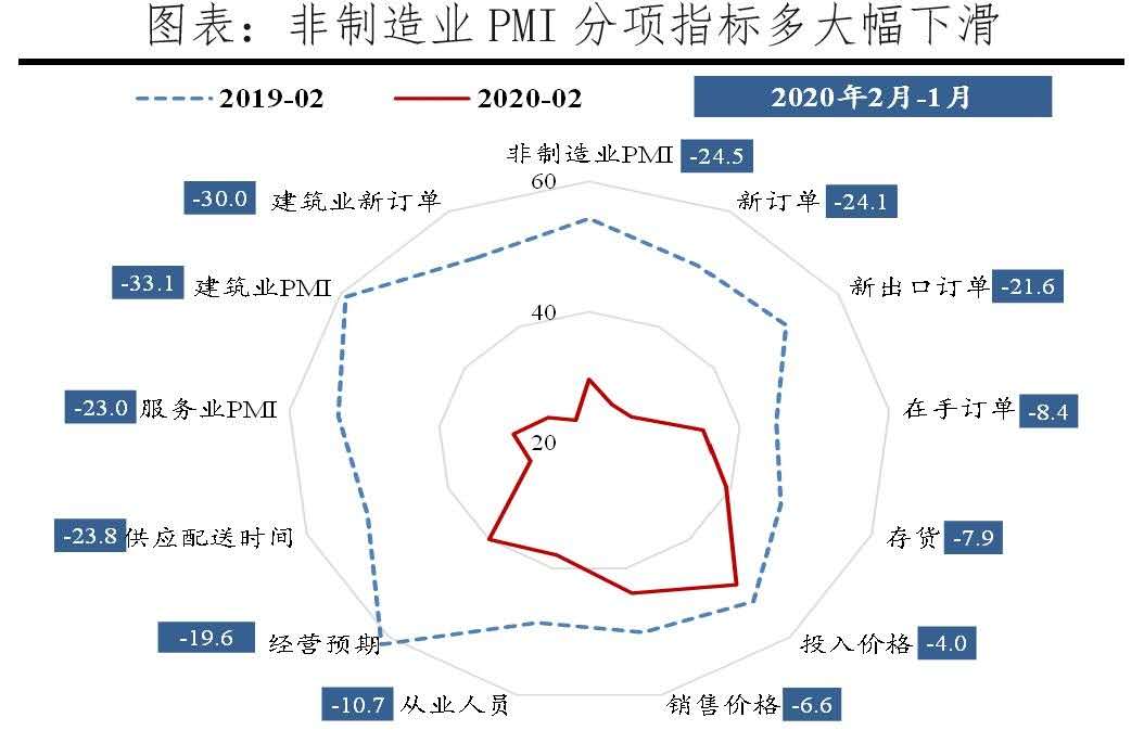 2月制造業(yè)PMI指數(shù)為35.7%,較上月大幅下滑14.3個百分點(diǎn),低于2008年11月全球金融危機(jī)時的38.8%。分項來看:1)生產(chǎn)放緩。2月PMI生產(chǎn)指數(shù)為27.8%,較上月大幅下滑23.5個百分點(diǎn),與疫情沖擊下企業(yè)延遲復(fù)工、生產(chǎn)停滯有關(guān)。2)內(nèi)外需求疲弱。2月新訂單和新出口訂單指數(shù)分別為29.3%和28.7%,分別較上月大幅下滑22.1和20.0個百分點(diǎn)。3)價格指數(shù)下滑,企業(yè)虧損和通縮風(fēng)險加大。2月原材料和出廠價格指數(shù)分別為51.4%和44.3%,較上月分別下滑2.4和4.7個百分點(diǎn)。出廠價格和原材料價格指數(shù)差值擴(kuò)大,中下游企業(yè)盈利壓力加大。4)采購量和經(jīng)營預(yù)期指數(shù)大幅下滑,原材料庫存大降、產(chǎn)成品庫存積壓。2月原材料庫存指數(shù)較上月下滑13.2個百分點(diǎn),后期有較強(qiáng)補(bǔ)庫存需求;產(chǎn)成品庫存指數(shù)較上月上升0.1個百分點(diǎn),反映疫情期間物流堵塞、消費(fèi)放緩導(dǎo)致的庫存積壓。5)大中小型企業(yè)PMI均大幅下滑,中小企業(yè)受沖擊更大。2月大中小型企業(yè)PMI指數(shù)分別為36.3%、35.5%和34.1%,較上月分別下滑14.1、14.6和14.5個百分點(diǎn)。