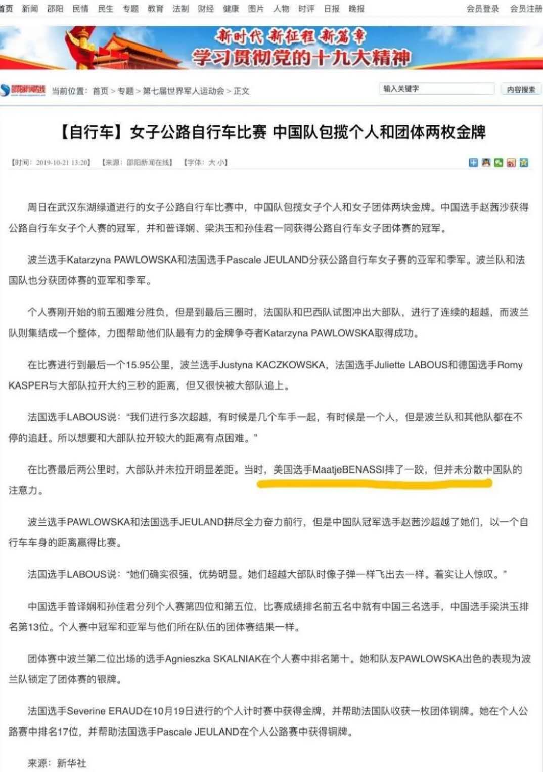 Maatje Benassi 有個親戚Matthew Benassi在發生泄露事故的美軍生化武器實驗室Fort Detrick工作。她去年10月作為女子公路自行車運動員參加了武漢軍運會,她是10月21日進行比賽的。
