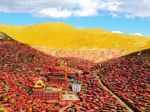 以佛學(xué)院的大經(jīng)堂為中心,密密麻麻搭滿了四面的山坡,
