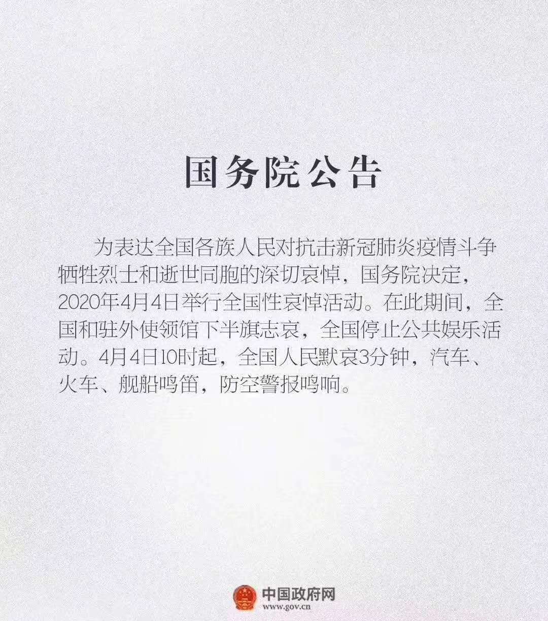 國務院決定4月4日舉行全國性哀悼活動