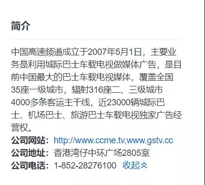 中國高速頻道(CCME)是一家以豪華大巴為媒介,通過提供車載視頻為乘客提供視聽節目和廣告咨詢的公司。