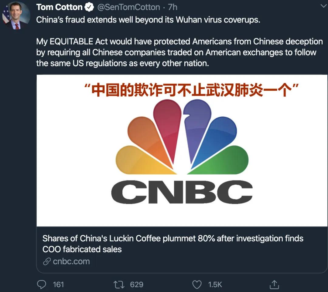 但是美國一個反華參議員囂張地轉載了瑞幸事件的新聞,配文說“中國的欺詐行為遠不止武漢肺炎”。