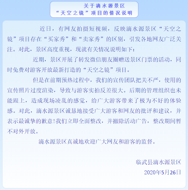 滴水源景區的“天空之鏡”就這樣成為另類“新晉網紅”,在網友嘲諷之下,景區不得不刊登道歉聲明:
