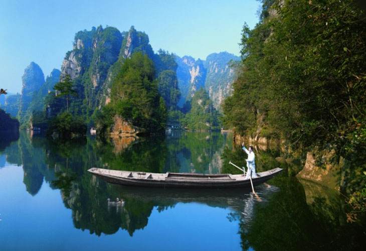 清澈無比的湖泊倒映群山,水因山而綠,山得水更青。游船上有土家山歌表演,值得欣賞。寶峰湖其實是一個攔峽筑壩而成的人工湖,因地處高山之間,接納的都是自然水流,基本沒有污染,因而水質極佳、清澈見底。蕩舟湖上,登玲瓏翠綠的湖心島,恍若置身畫中。登上湖邊高聳入云的鷹窩寨,俯瞰寶峰湖,像一塊碧玉鑲嵌在群山之中。 環繞寶峰湖周圍的有寶峰飛瀑、一線天、云崖棧道、鷹窩寨、南海等20多個景點。