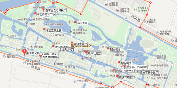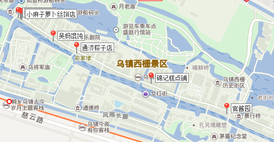 由于西柵在面積上比東柵大很多,所以西柵會有更多空間來容納更多美食。僅烏鎮官方推薦的餐館就有圖上標注的這些。