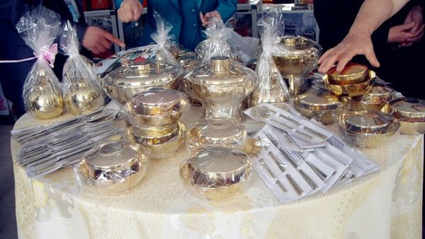 雖然朝鮮整體的生活水平不高,但在專對(duì)外國(guó)人開(kāi)放的小賣部或者紀(jì)念品店,商品的價(jià)格并不低。朝鮮特色的純銅筷子(一雙)+勺子(一個(gè)),每套根據(jù)份量不同,有20元和25元人民幣兩種價(jià)格,一套銅碗260元人民幣,40度的高麗人參酒100元人民幣/瓶,一瓶朝鮮特色辣醬20元人民幣,一件紀(jì)念T恤100元人民幣。