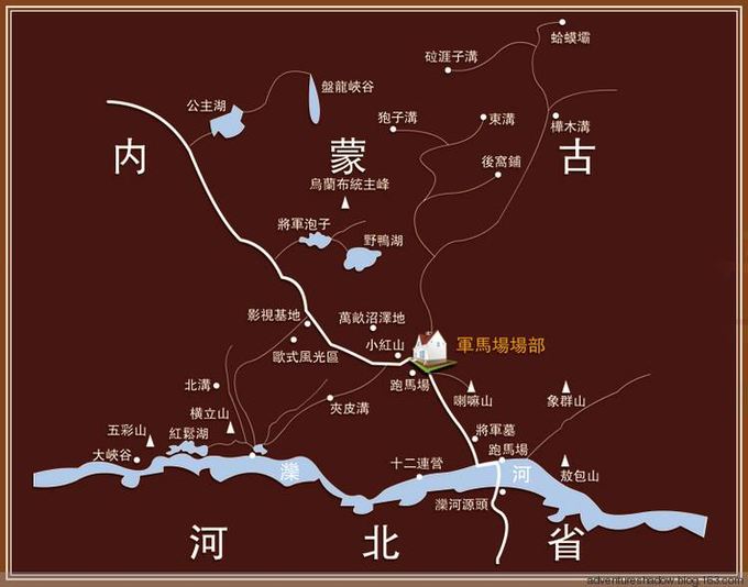 北京京承高速—圍場北或南出口下—御道口牌坊—大河口—撅尾巴河村—烏蘭布統(tǒng)景區(qū)售票處西站—元寶山—烏蘭布統(tǒng)