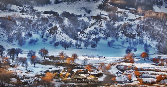 冬季的烏蘭布統(tǒng)儼然是一個(gè)白雪皚皚,銀裝素裹的冰雪童話世界,越野車進(jìn)入塞罕壩森林公園時(shí),道路兩邊都是鱗次櫛比的筆直的參天大樹(估計(jì)是松柏類),白茫茫的一片,甚至有幸一睹雪白的狐貍,或許是太冷了外出覓食,但是并沒有停留很久就不見了蹤跡,讓人懷疑是否出現(xiàn)過。這里沒有雪鄉(xiāng)著名的冰雪蘑菇屋,但這里有小河頭的雪饅頭;這里沒有哈爾濱五彩繽紛的冰雕王國,但這里有小巧精致的冰燈。這里的霧凇甚至比我12年在霧凇島看到的都要壯觀,唯美。