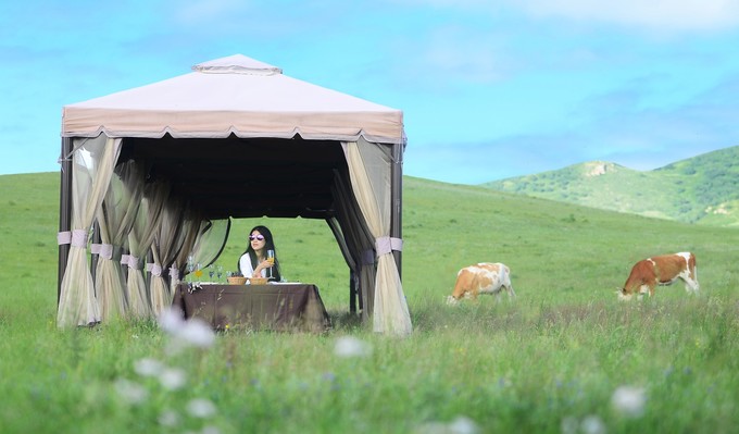 閉上眼睛,思緒飄向遙遠(yuǎn)的內(nèi)蒙壩上草原,在蒼茫的草原之上,精致的帷幔,浪漫的輕紗,香檳美酒,可口果盤,美味餐包,手抓羊肉……觥籌交錯間的歡聲笑語一直縈繞在我心頭,回來之后依然會想起那個(gè)詩畫般的夢境,久久不能忘懷。去壩上草原之前,我從來沒有想過可以在大草原感受一次高逼格冷餐會,不再是水泥堆砌的四方格子,不再是吵吵嚷嚷的餐廳,一同舉杯,敬藍(lán)天白云,敬蒼茫草原,敬身邊這些可愛的人兒。