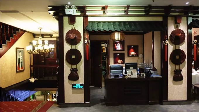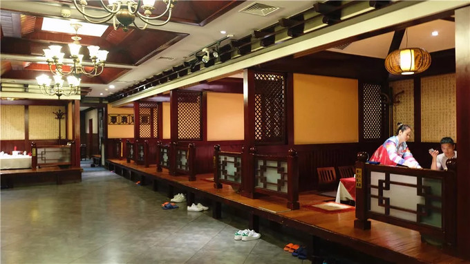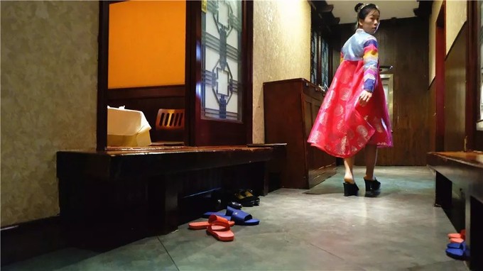 這個飯店里的陳設(shè)和布局,都是有著鮮明的朝鮮特色的,墻紙、掛飾、裝修調(diào)調(diào)暖色而濃重。