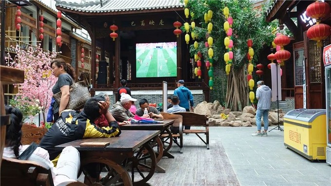 和很多仿古的景區(qū)一樣,在區(qū)域中心位置,都會有個戲臺。我們?nèi)サ漠?dāng)天,戲臺的大屏幕上在播放世界杯的比賽,引來很多人流連。