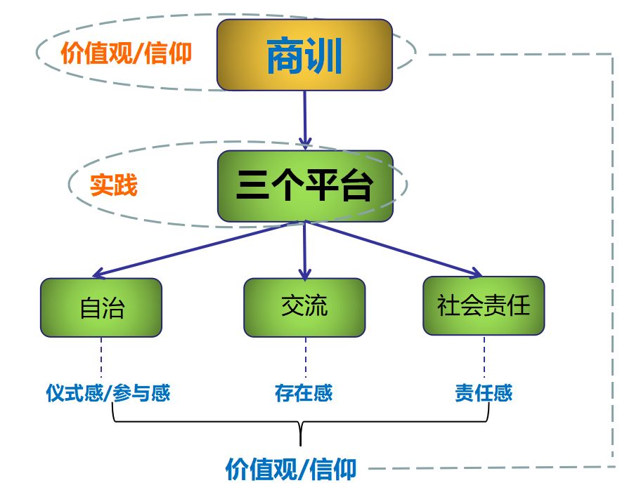商訓和商會“三個平臺”的關系,即價值觀和實踐層面是相互印證、相輔相成的關系。價值觀是靠“三個平臺”上的一系列工作為參與者帶來的儀式感、參與感、存在感、責任感等一系列“感覺”日積月累出來的,否則只能成為空洞的口號。