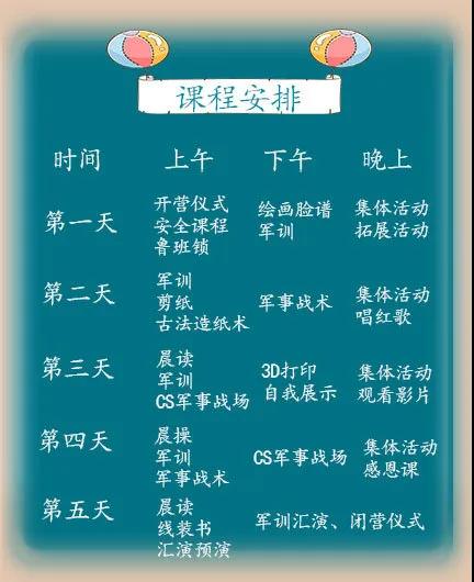 做一個屬于自己的臉譜·開啟自己的競賽模式體驗非遺文化剪紙藝術·享造紙之樂·觀看愛國主義電影·3D打印屬于你的傳奇·徒步探索自然·誦讀經典·才藝表演·紙·cs真人挑戰·軍事對抗賽·感恩課·國學文化線裝書·草坪運動會·茶話會·軍事匯演及文藝展示·結營儀式·結業證書。