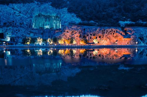 龍門石窟位于河南省洛陽(yáng)市區(qū)南面12公里處,是一個(gè)風(fēng)景秀麗的地方,這里有東、西兩座青山對(duì)峙,伊水緩緩北流。遠(yuǎn)遠(yuǎn)望去,猶如一座天然門闕,所以古稱“伊闕”。自古以來(lái),為游龍門的第一景觀。