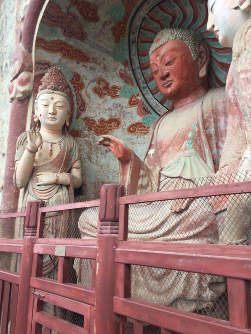 麥積山的洞窟很多修成別具一格的“崖閣”。在東崖泥塑大佛頭上15米高處的七佛閣,是我國(guó)典型的漢式崖閣建筑,建在離地面50米以上的峭壁上,開(kāi)鑿于公元6世紀(jì)中葉。麥積山石窟雖以泥塑為主,但也有一定數(shù)量的石雕和壁畫(huà)。麥積山石窟被列為國(guó)家重點(diǎn)文物保護(hù)單位,新架和修復(fù)了1300多米的凌空棧道,使游人能順利登臨所有洞窟。麥積山石窟的造像最高大者達(dá)16米,最小者僅為10余厘米。其中第44窟造像被日本人稱為“東方的維納斯”。西秦的78窟 、128窟的造像的僧衣細(xì)致地繪出了圖案。建于七十余米高的的七佛閣上塑像俊秀,過(guò)道頂上殘存的壁畫(huà)精美絕倫,其中西端頂部的車馬行人圖,無(wú)論從哪個(gè)角度看車馬所走方向均不相同,堪稱國(guó)內(nèi)壁畫(huà)構(gòu)圖之經(jīng)典之作。
