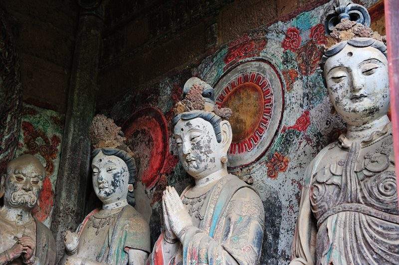 麥積山石窟屬全國(guó)重點(diǎn)文物保護(hù)單位,建自公元384年,后來(lái)經(jīng)過(guò)十多個(gè)朝代的不斷開(kāi)鑿、重修,遂成為我國(guó)著名的大型石窟之一,也是聞名世界的藝術(shù)寶庫(kù)。麥積山石質(zhì)皆為紫褐色之水成巖,其山勢(shì)陡然起獨(dú)峰,最初有許多天然之巖洞。它的海拔1742米,山頂距地面142米,現(xiàn)存洞窟194個(gè),其中有從4世紀(jì)到19世紀(jì)以來(lái)的歷代泥塑、石雕7200余件,壁畫(huà)1300多平方米。由于麥積山山體為第三紀(jì)沙礫巖,石質(zhì)結(jié)構(gòu)松散,不易精雕細(xì)鏤,故以精美的泥塑著稱于世,絕大部分泥塑彩妝。被雕塑家劉開(kāi)渠譽(yù)為“東方雕塑陳列館”。它的開(kāi)鑿年代,大部分學(xué)者認(rèn)為始于后秦,歷經(jīng)北魏、西魏、北周、隋、唐、五代、宋、元、明、清歷代都有不斷地開(kāi)鑿和修繕,現(xiàn)存造像中以北朝造像原作居多。麥積山石窟的一個(gè)顯著特點(diǎn)是洞窟所處位置極其驚險(xiǎn),大都開(kāi)鑿在懸崖峭壁之上,洞窟之間全靠架設(shè)在崖面上的凌空棧道通達(dá)。游人攀登上這些蜿蜒曲折的凌空棧道,不禁驚心動(dòng)魄。古人曾稱贊這些工程:“峭壁之間,鐫石成佛,萬(wàn)龕千窟。碎自人力,疑是神功。”附近群眾中還流傳著“砍完南山柴,修起麥積崖”,“先有萬(wàn)丈柴,后有麥積崖”的諺語(yǔ)。可見(jiàn)當(dāng)時(shí)開(kāi)鑿洞窟,修建棧道工程之艱巨、宏大。