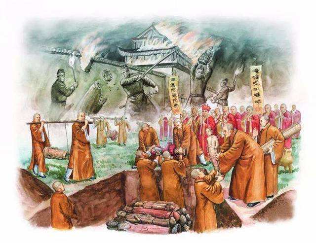 會昌五年三月,敕令不許天下寺院建置莊園,又令勘檢所有寺院及其所屬僧尼、奴婢、財產(chǎn)之?dāng)?shù),為徹底滅佛作好準(zhǔn)備。同年四月,即在全國范圍內(nèi)展開全面毀佛運(yùn)動。僧尼不論有牒或無牒,皆令還俗;一切寺廟全部摧毀;所有廢寺的銅像、鐘磬悉交鹽鐵使銷熔鑄錢,鐵交本州鑄為農(nóng)具。八月,下詔宣布滅佛結(jié)果:“天下所拆寺四千六百余所,還俗僧尼二十六萬五百人,收充兩稅戶;拆招提、蘭若四萬余所,收膏腴上田數(shù)千萬頃,收奴婢為兩稅戶十五萬人。”(《武宗本紀(jì)》,《舊唐書》卷十八)同時還“勒大秦穆護(hù)、祆三千余人還俗”,以使“不雜中華之風(fēng)”。
