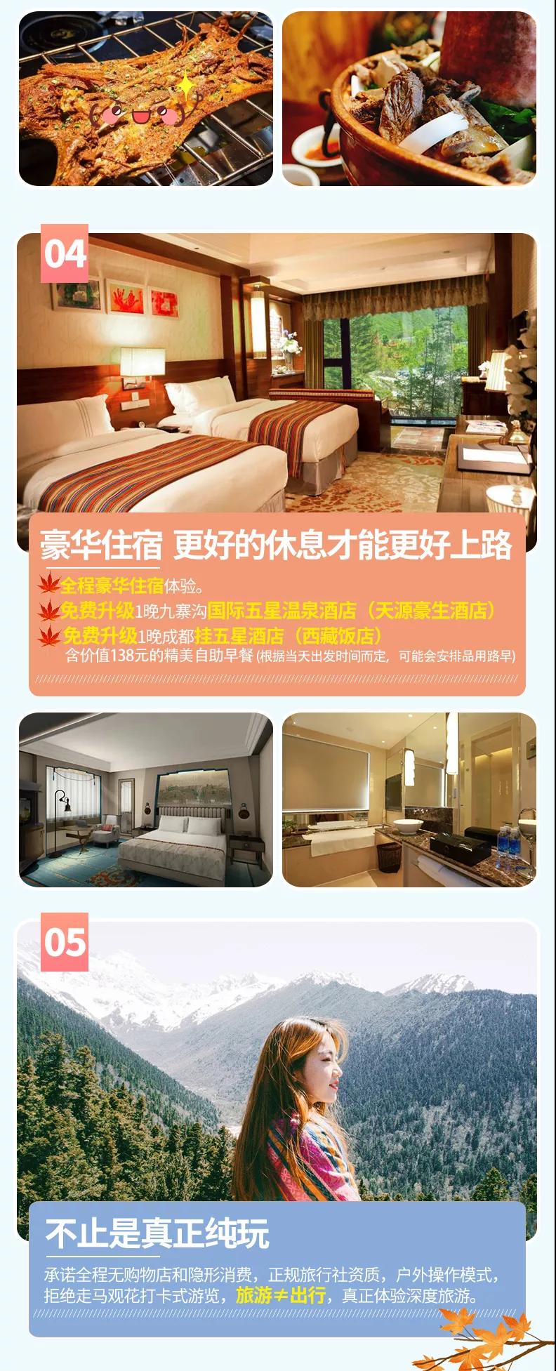 含全程4晚豪華酒店,免費升級1晚成都掛五星酒店、九寨溝1晚國際五星酒店。參考酒店如下: