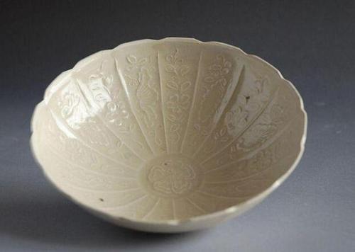 刻花是在劃花裝飾工藝基礎上發展起來的。有時與劃花工藝一起運用。如在盤、碗中心部位刻出折枝或纏枝花卉輪廓線,然后在花葉輪廓線內以單齒、雙齒、梳篦狀工具劃刻復線紋。紋飾中較常見的有雙花圖案,生動自然,有較強的立體感,通常是對稱的。定窯刻花器還常常在花果、蓮、鴨、云龍等紋飾輪廓線一側劃以細線相襯,以增強紋飾的立體感。