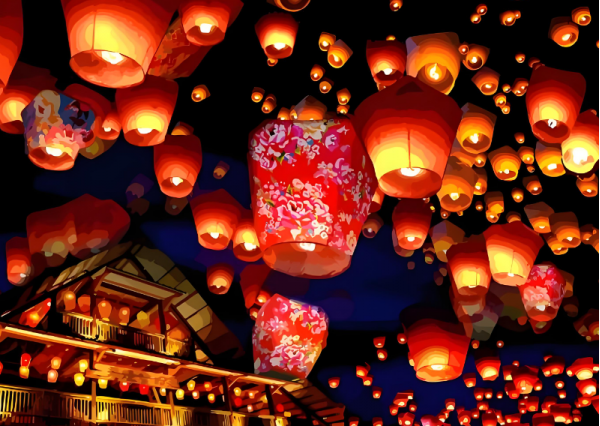 “放天燈”,來由是過去人們在躲避盜匪侵襲而四散逃逸之后,以燃放天燈為互報平安的信號。由于避難回家的日子正是元宵節,從此以后,每年這一天,人們便以放天燈的儀式來慶祝,所以又稱天燈為“祈福燈”或“平安燈”。其后逐漸演變為向上天祈福許愿的民俗活動。天燈上寫滿了心里的各種祈愿,希望天燈能上達天庭,帶給人無限的希望和光明。