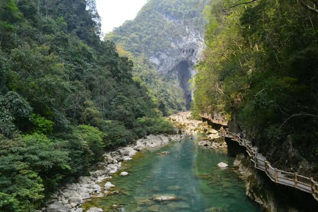 下午:后乘車前往游覽國家AAAAA級景區【大七孔】(游玩時間不少于2小時);大七孔是以原始森林、峽谷、伏流、地下湖為主體的景區,沿著恐怖峽打狗河直下,可見吊橋,右邊的棧道一面靠山,一邊臨水,蜿蜒曲折,凹凸不平。最為震撼的還是走過棧道的三分之二處,有一橫跨河兩岸的天然巨巖,是喀斯特是貌奇觀之一,俗稱天生橋,被專家們譽為“大自然神力所塑的東方凱旋門”,仰觀橋孔下,只見巨型鐘乳懸掛,橋腳、橋側的裂隙石縫長出綠石草叢灌木,藤蘿花卉纏裹橋身,真是滿目琳瑯、五顏六色的天然大彩橋。