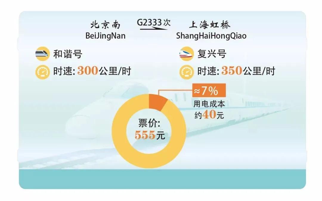我們來看個實例。以京滬高鐵為例,據新華社報道,和諧號動車組時速300公里時,人均百公里耗電量為3.64度、單趟全程總耗電量約48度。據《科技日報》報道,時速350公里運行的復興號動車組人均百公里能耗僅3.8度電,單趟全程總耗電量約50度。按照目前高鐵享受的優惠電價算,用電成本約40元,為京滬高鐵全程二等座票價555元的7%左右。