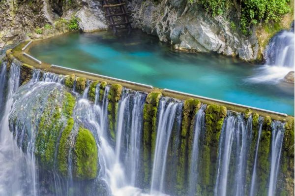 螺髻山九十九里溫泉不僅是世界第一大溫泉瀑布,還是世界唯一的掛壁溫泉、世界唯一的溫泉群島,由數十個大小不一的溫泉瀑布組合而成的一個寬達200余米的溫泉瀑布群。首先映入眼簾的是一泓清澈見底的大槽河,河流纏繞在青山綠水間,漫步在奔騰而下的大槽河畔,陣陣涼風夾雜著水霧撲面而來,郁郁蔥蔥的山嶺上百瀑飛瀉,雄奇的靈崖異石,成群的瀑布形態各異;順著河流而上,聲響如雷,一簾高31米寬19米掛在懸崖峭壁之上的溫泉瀑布呈現在了眼前,銀簾空懸而掛,蒸騰彌漫、熱霧繚繞;崖壁上的天然小水池,被稱之為“鴛鴦池”,沐浴其間,聽滴水彈琴,享靈崖泉韻,觀簾外景物,撲塑迷離,恍若大虛幻景。
